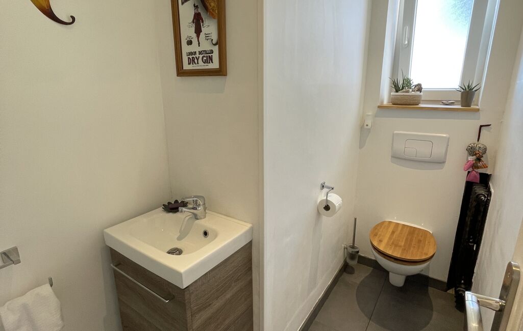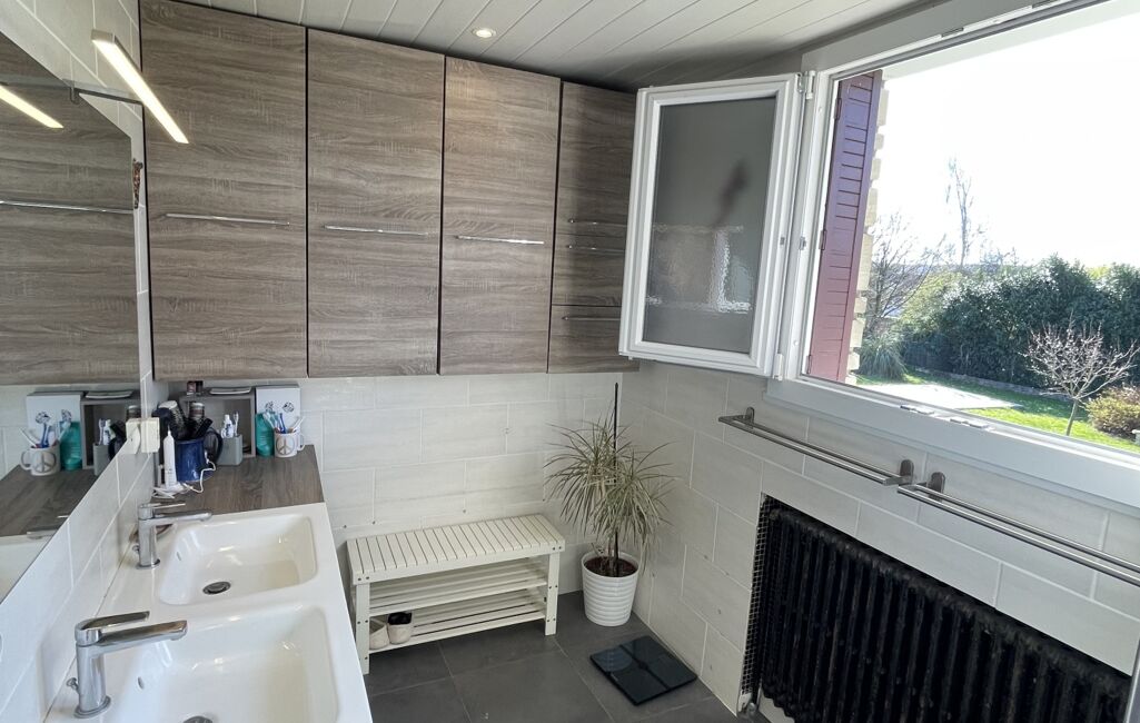 Au Rez de jardin, le couloir dessert une grande chambre, un wc, une buanderie, une cave à vins, un garage double avec portes séquentielles motorisées. Chaudière à condensation au gaz de ville. Tout-à-l'égout, VMC, FIBRE et Alarme.