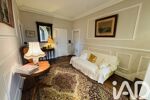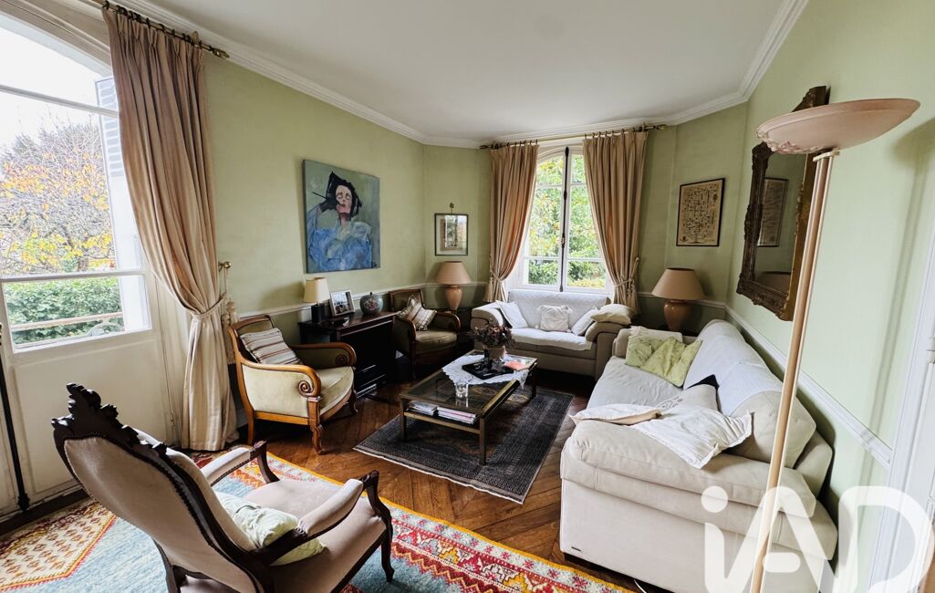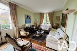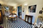 Une vaste entrée dessert un bureau, un séjour lumineux avec cheminée d'origine, et une cuisine fermée aménagée et équipée donnant sur une véranda avec un accès à la terrasse et au jardin.