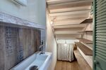Baignoire, douche, rangement intégré et fermé et également un cabinet d’aisances.