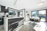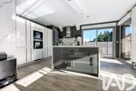 •La spacieuse cuisine entièrement équipée, véritable pièce maîtresse de la maison, propose un design contemporain avec de grandes colonnes de rangement aux façades épurées intégrant l’électroménager, associées à un îlot central. Un espace aussi esthétique que fonctionnel également ouvert sur les extérieurs.