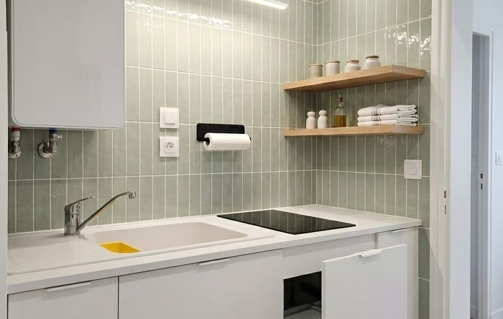 Dès l’entrée, vous découvrez un espace fonctionnel avec placard aménagé et kitchenette.