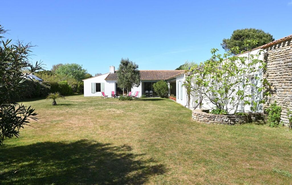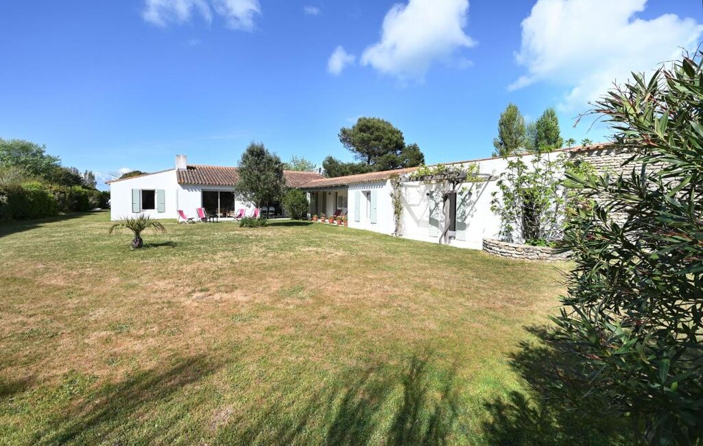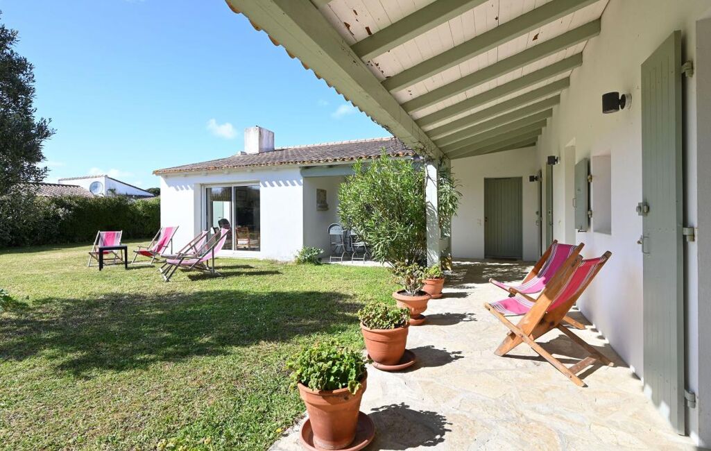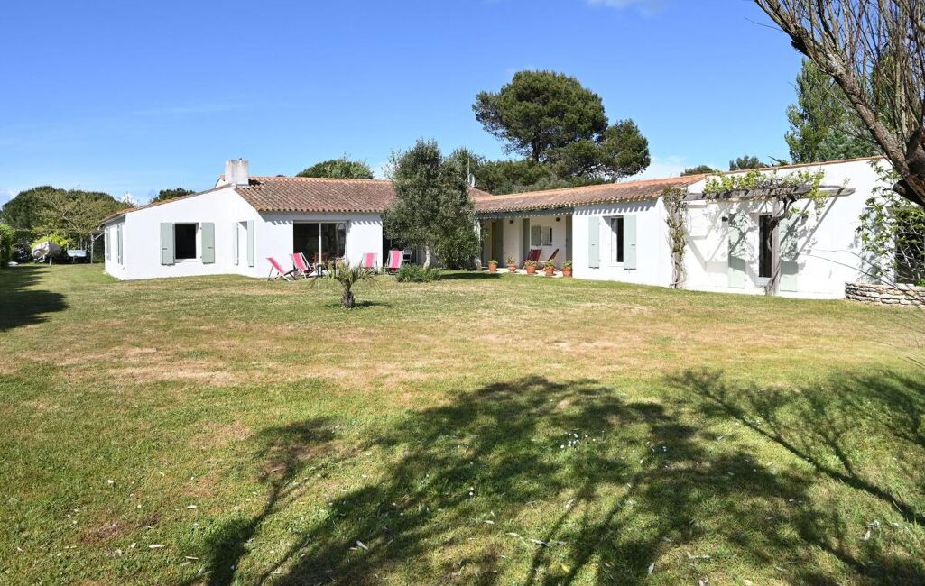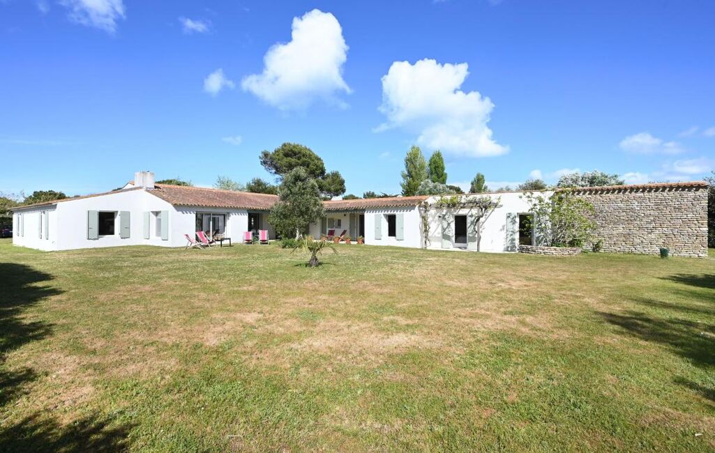 Immobilier Les Portes en Ré - Entre golf et plages, cette propriété familiale se distingue par son organisation en deux espaces de vie. Elle offre un séjour avec cheminée aux volumes généreux, ainsi que deux chambres dans une première partie. La seconde, accessible par une galerie extérieure, développe quatre chambres supplémentaires, prolongées par une chambre complémentaire.