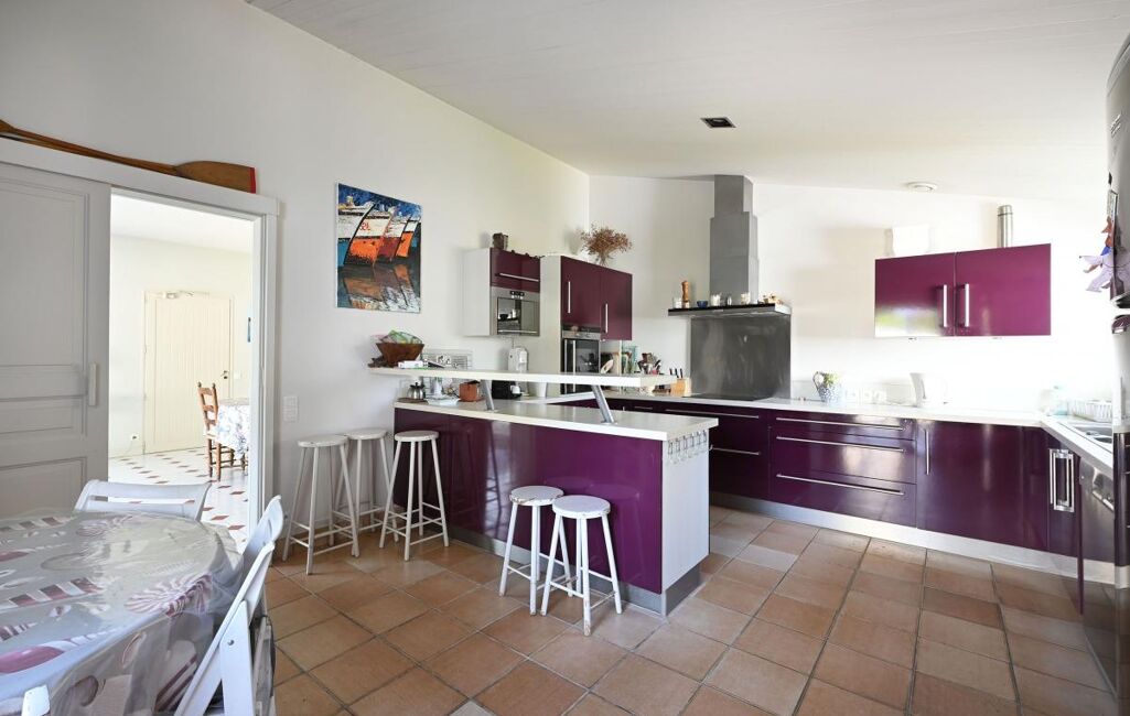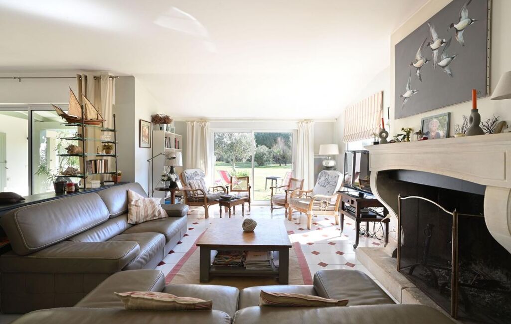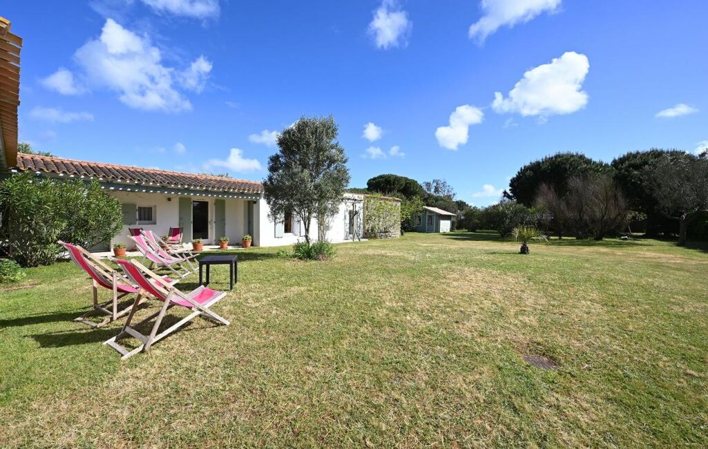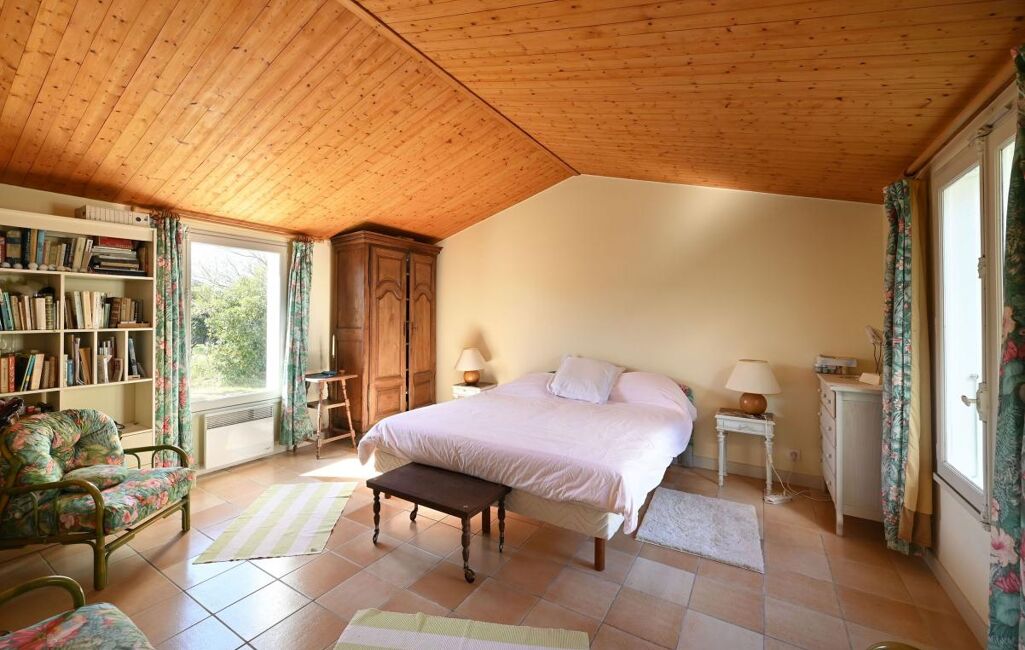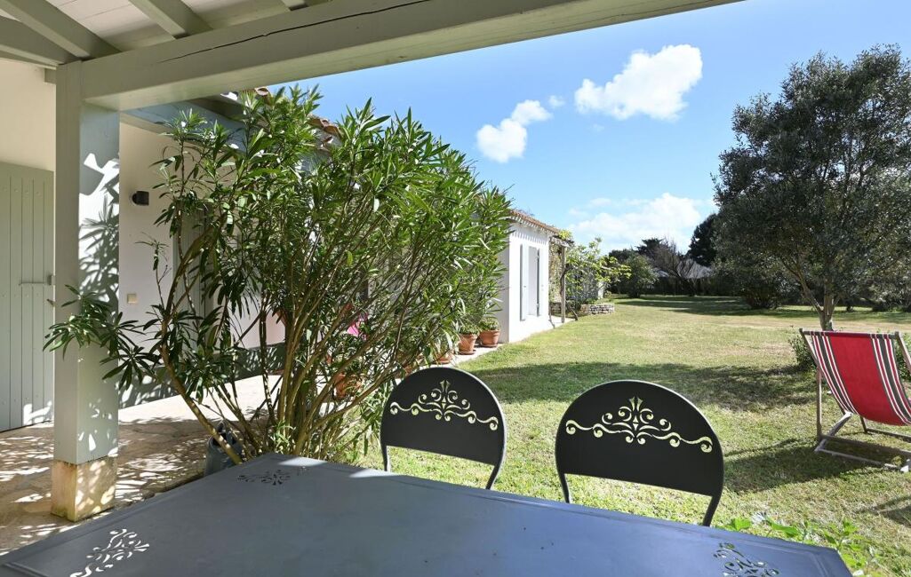 Immobilier Les Portes en Ré - Entre golf et plages, cette propriété familiale se distingue par son organisation en deux espaces de vie. Elle offre un séjour avec cheminée aux volumes généreux, ainsi que deux chambres dans une première partie. La seconde, accessible par une galerie extérieure, développe quatre chambres supplémentaires, prolongées par une chambre complémentaire.