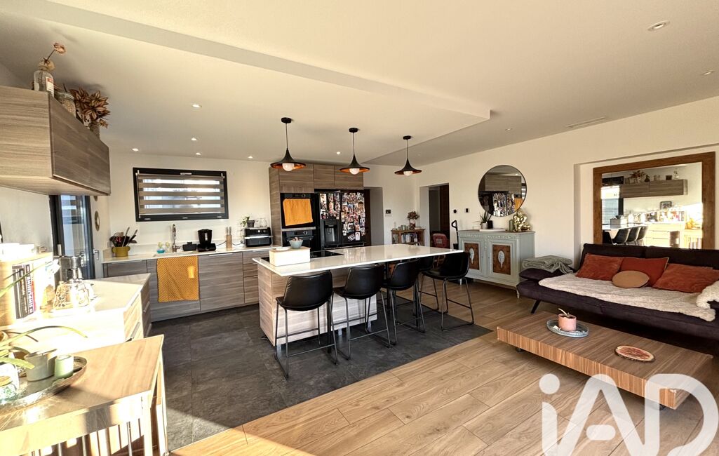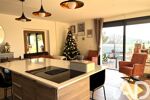 Elle offre une pièce de vie lumineuse avec cuisine ouverte et îlot, ouvrant sur une terrasse bois de 100 m² avec vue panoramique sans vis-à-vis.