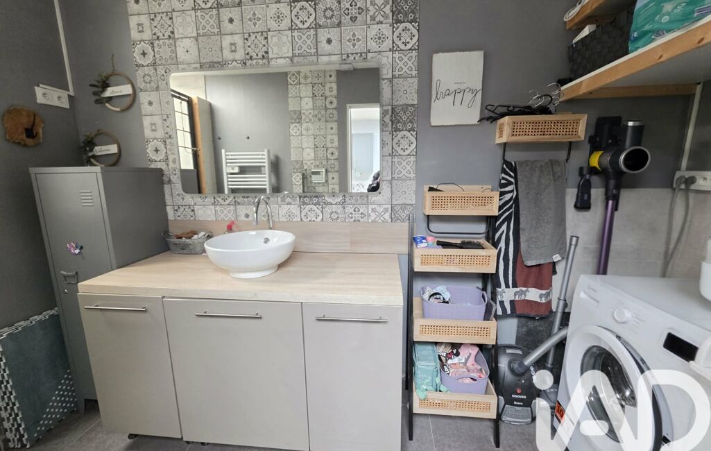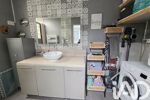 Une salle de d'eau avec douche à l'italienne, simple vasque et son coin buanderie.