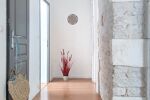 À l’étage, on retrouve encore et toujours le charme de la pierre, apportant chaleur et caractère. Un premier palier dessert trois confortables chambres, dont une avec espace dressing, ainsi qu’un grand placard indépendant. Un second palier mène à une quatrième chambre, un WC et une salle d’eau, à la décoration soignée, avec douche à l’italienne.