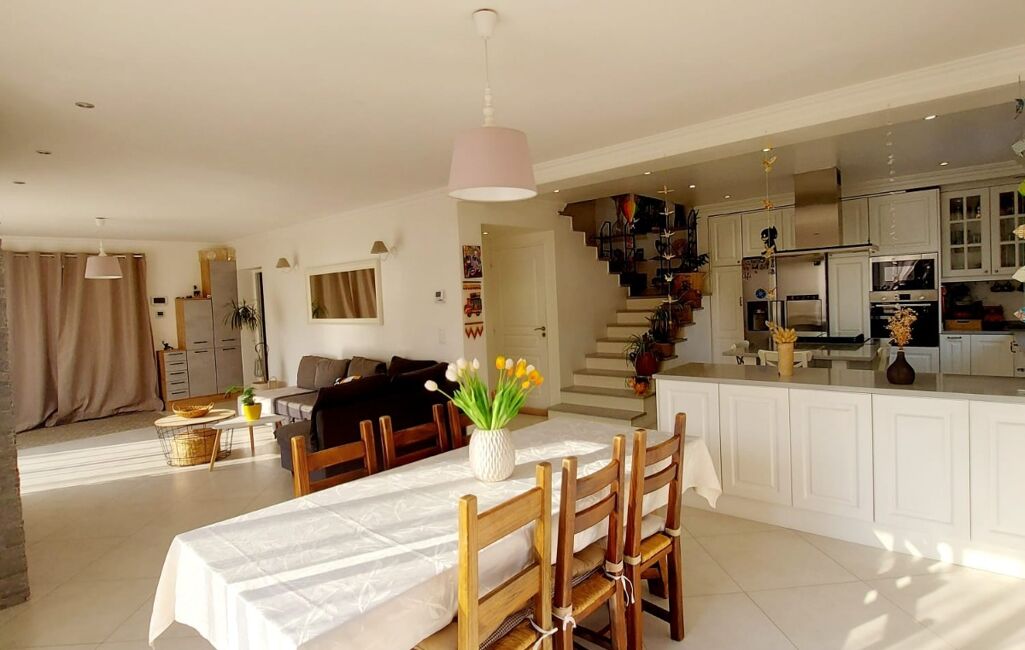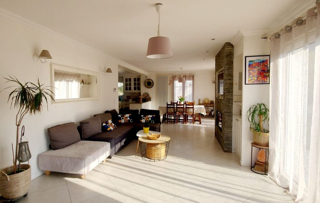 Le séjour, baigné de lumière, invite à la détente avec sa cheminée décorative — l’endroit idéal pour vos soirées en famille. La cuisine ouverte, moderne et conviviale, s’organise autour d’un îlot central, véritable cOEur de la maison où se mêlent petits-déjeuners dynamiques, devoirs des enfants et moments de partage.