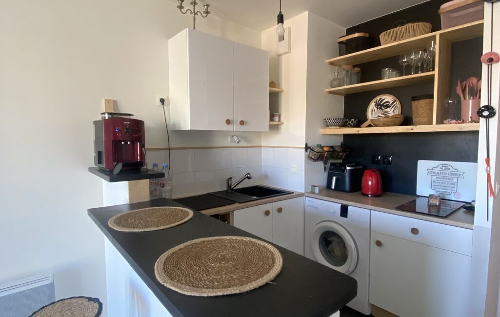 Entrée sur pièce de vie , salon SAM , coin cuisine aménagée , 1 chambre , 1 salle de bain , 1 WC .