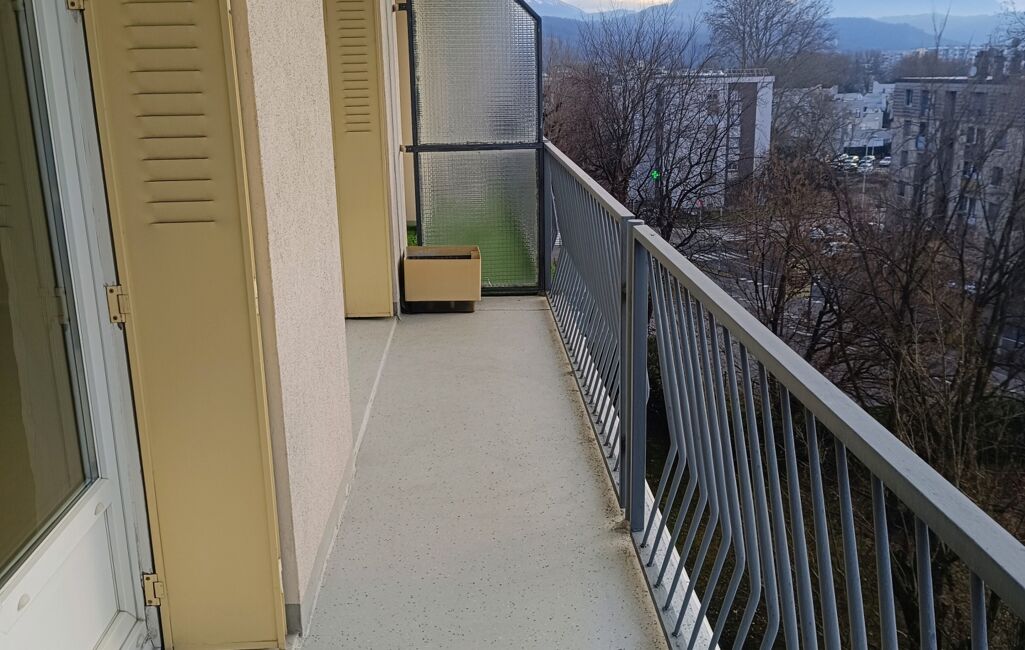 Un séjour double donne accès à un balcon de 6m2 environ avec vue sur le Vercors. Il est possible de créer une grande pièce de vie en abattant la cloison du milieu.