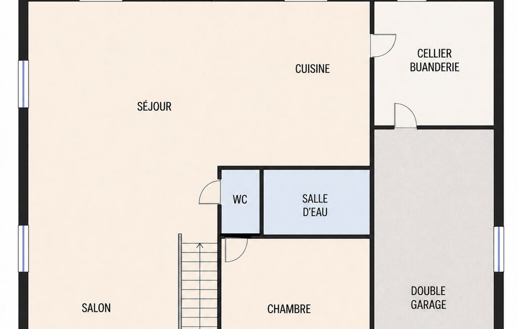Ce bien offre un espace de vie d'environ 60 m2 comprenant entrée, séjour salon et cuisine ouverte aménagée et équipée. Le rdc est complété par une chambre avec salle d'eau, un wc, et une buanderie/cellier.