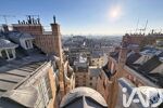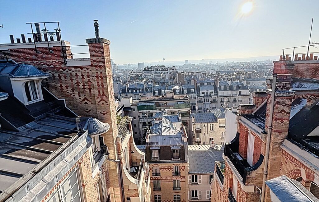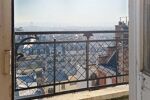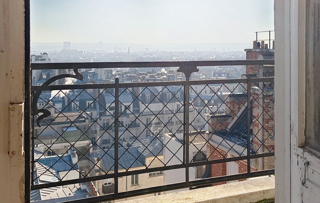De grandes fenêtres et une porte-fenêtre donnant accès au balcon offrent une vue imprenable sur les toits de Paris, créant une atmosphère paisible et inspirante.