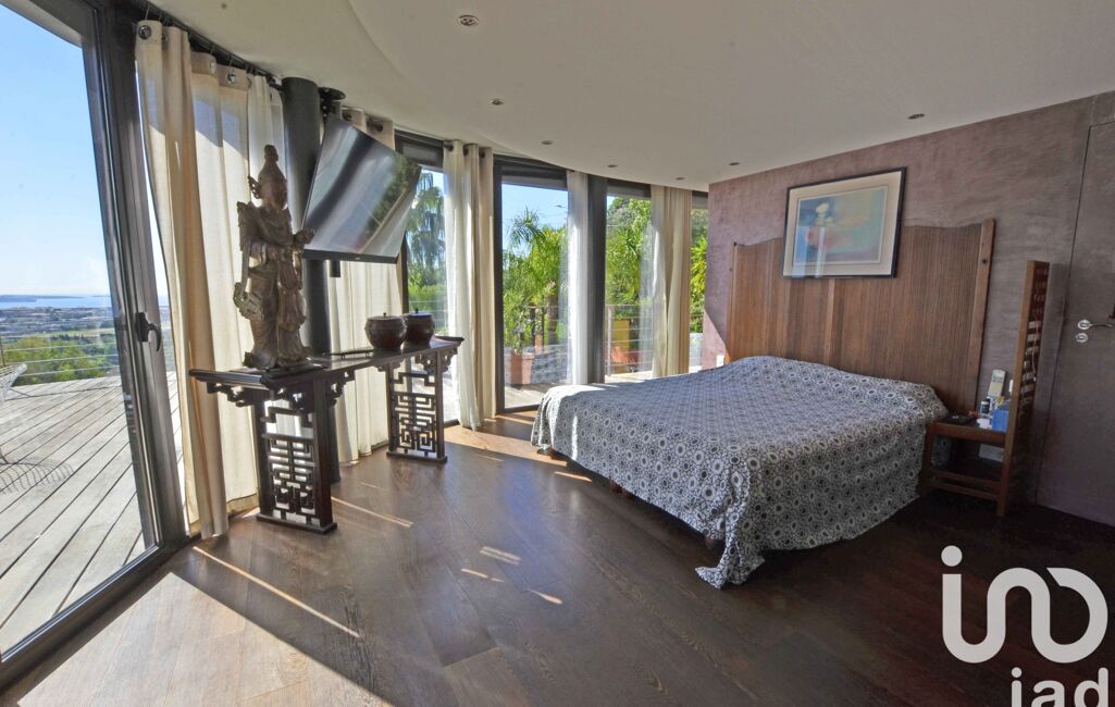 Derrière ses lignes arrondies et ses volumes généreux, elle dévoile environ 300 m² de surface habitable, ouverts sur un panorama exceptionnel : la Méditerranée scintillante, les îles de Lérins à l’horizon et les reliefs des montagnes en toile de fond.