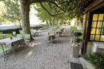 •une grande terrasse extérieure ombragée par des platanes centenaires