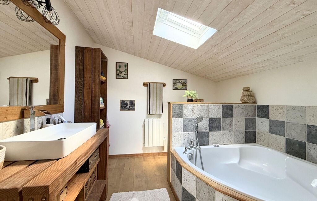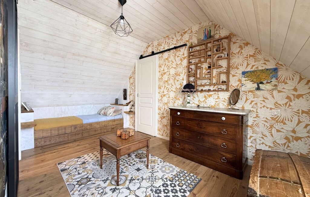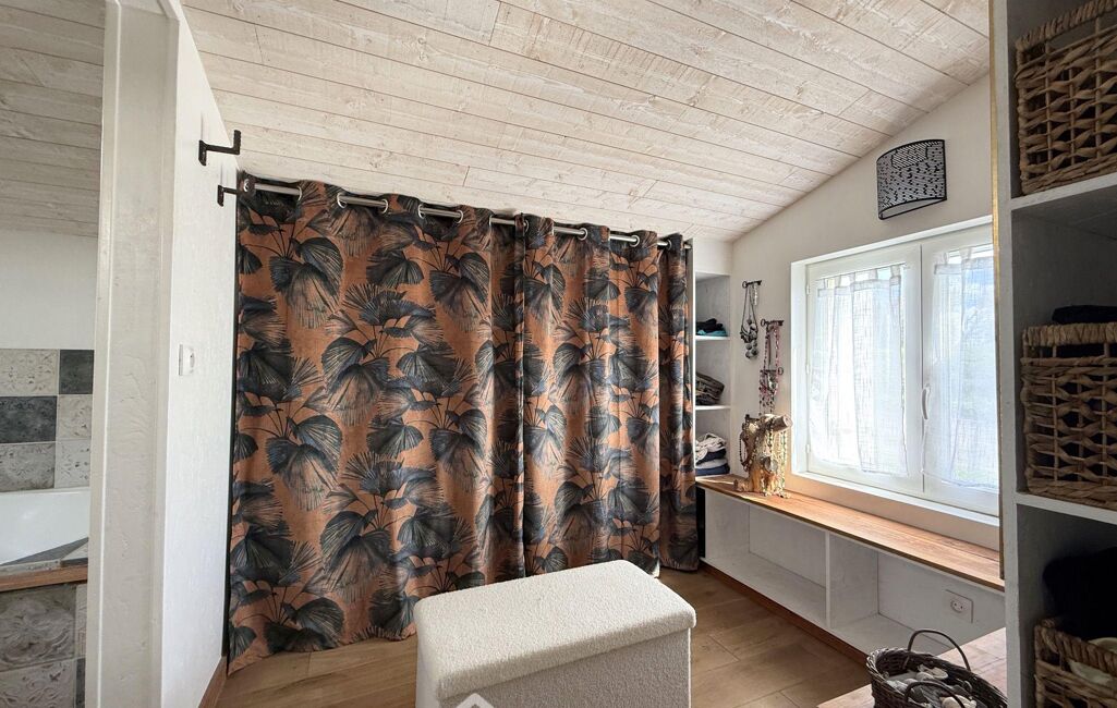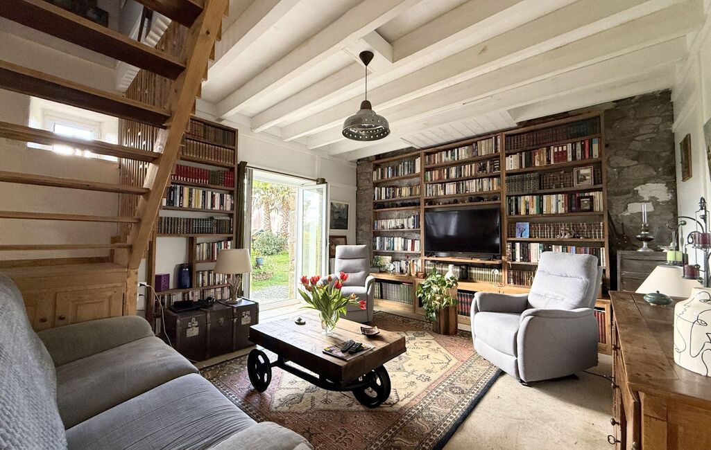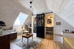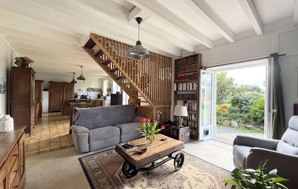 Le rez-de-chaussée se compose d'une belle pièce de vie de 50m2 baignée de lumière, incluant une cuisine ouverte, un espace salle à manger et un espace salon. Ce niveau comprend également un dressing de 5m2, une salle de bains de 6,5 m2 avec WC ainsi qu'une buanderie de 7m2 accessible par l'extérieur.