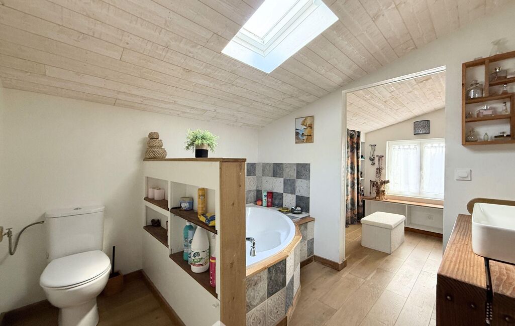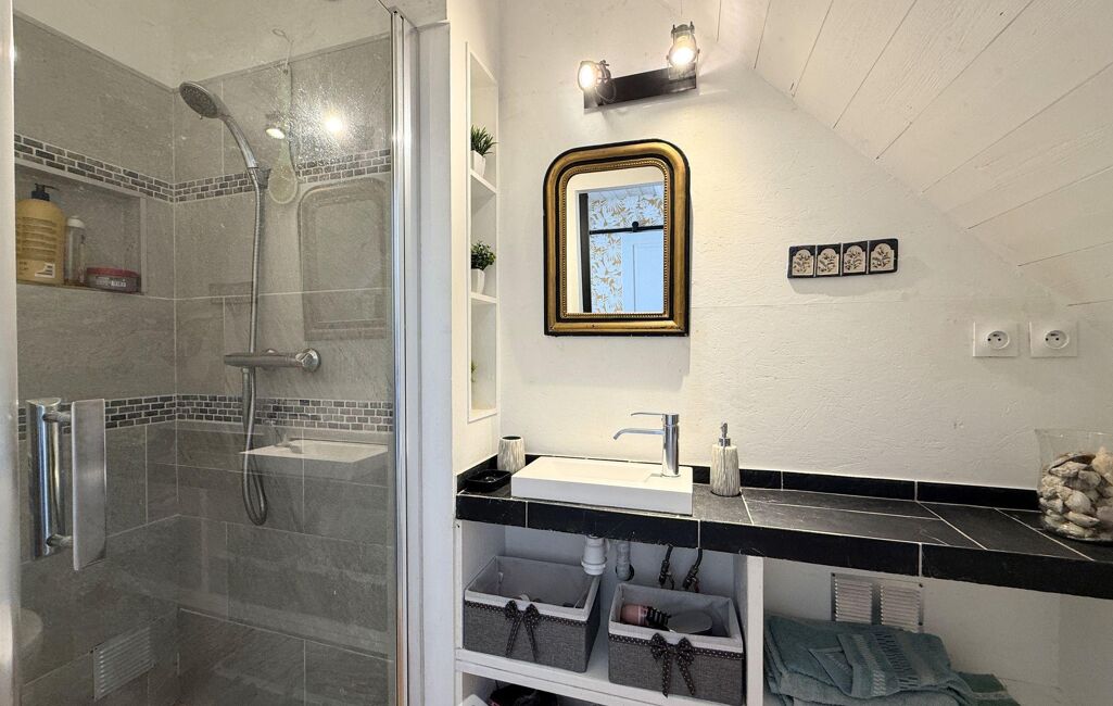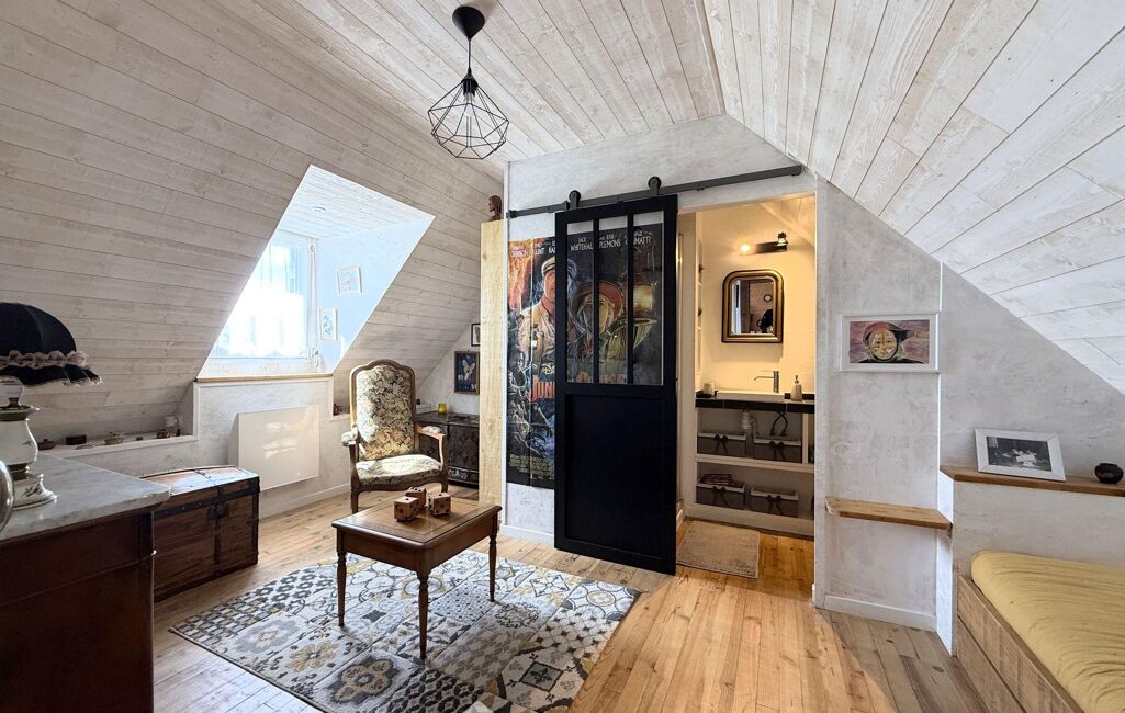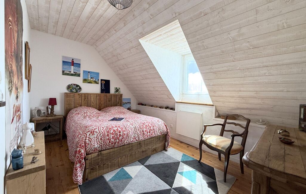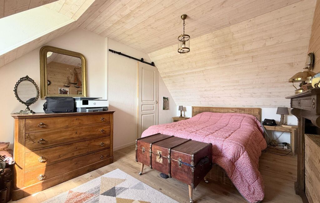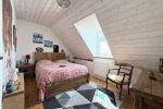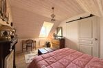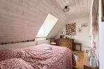 À l'étage, le palier dessert trois chambres de 11 m2 à 17 m2 au sol (9 m2 à 14 m2 habitables), dont l'une bénéficie d'une salle de douche privative avec WC.