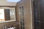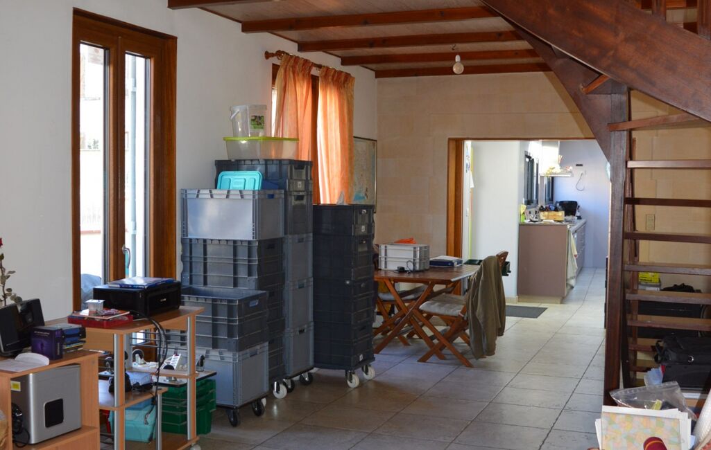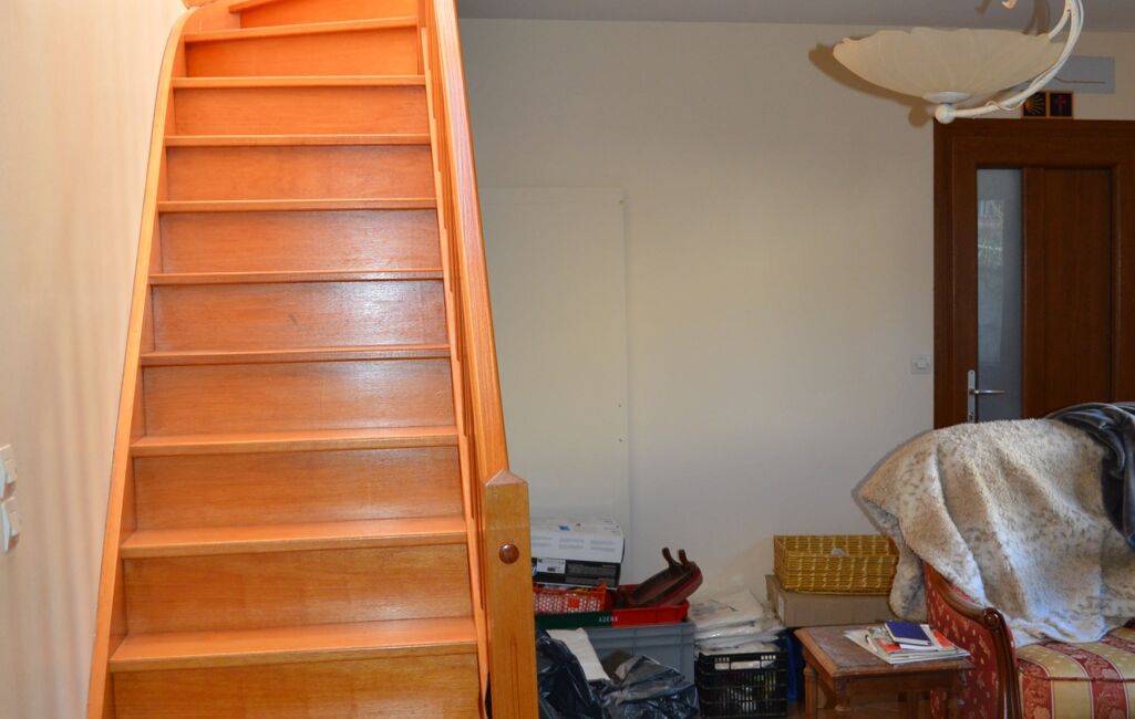 De la pièce de vie vous pourrez rejoindre la salle de bains puis un petit salon convivial qui permet l'accès au garage ainsi qu'à l’étage, un palier avec placards dessert 2 chambres et 1 salle d'eau avec toilettes.