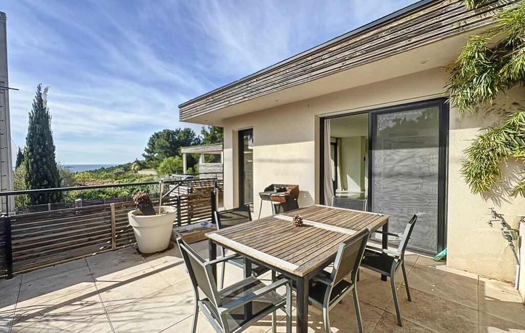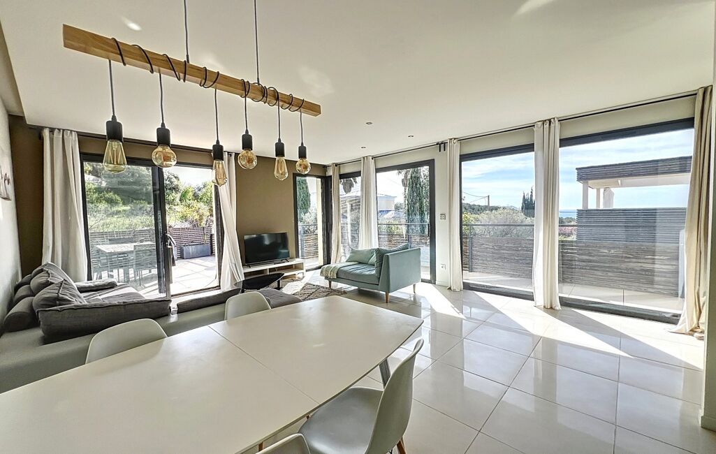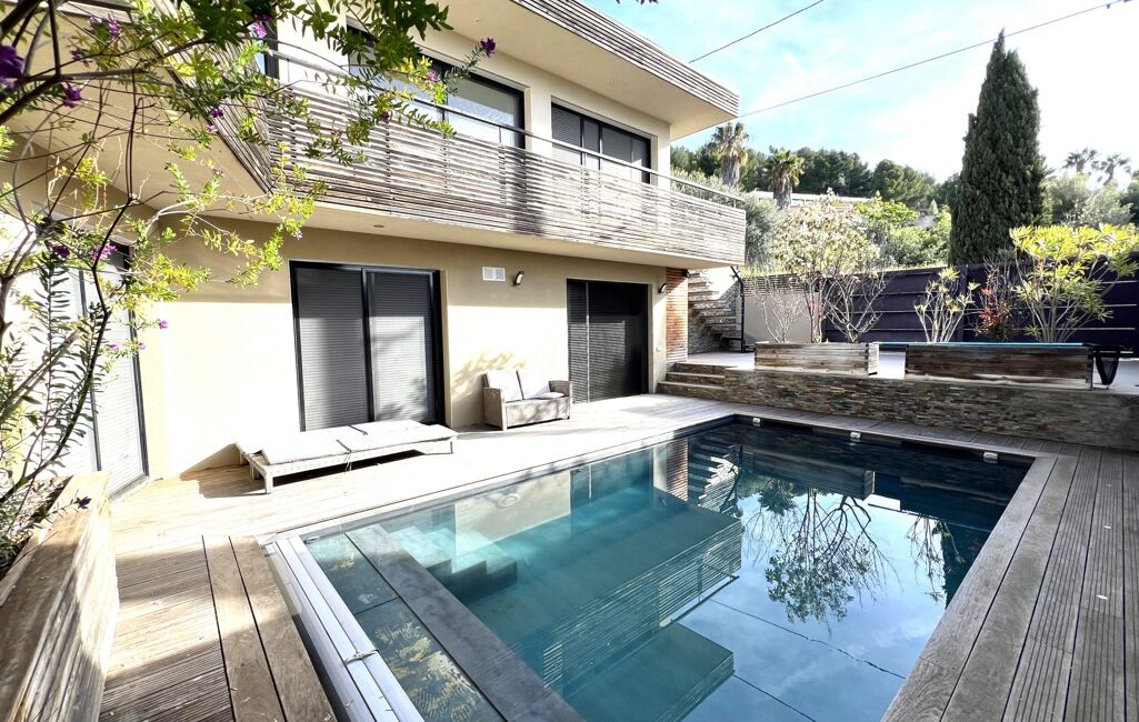 Proche commerces - À visiter à Bandol (83150) : maison 5 pièces avec piscine en vente, 130 m² de surface et construite sur 296 m² de terrain, orientée au sud. Elle est composée comme suit : une pièce à vivre, quatre chambres, une cuisine aménagée équipée, une salle de bains et deux salles d'eau. Deux places de parking et deux terrasses complètent le tout. Intérieur en excellent état. Vue sur mer. Coup de coeur.
