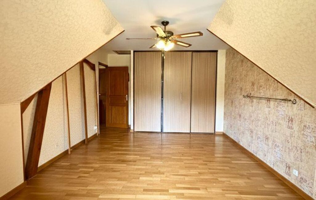 À l’étage, un palier distribue trois chambres spacieuses, dont deux avec placards et une avec balcon privatif, une vaste salle de bain et un WC indépendant.