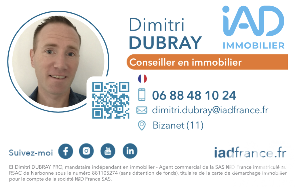 La présente annonce immobilière a été rédigée sous la responsabilité éditoriale de M Dimitri Dubray mandataire indépendant en immobilier (sans détention de fonds), agent commercial de la SAS I@D France immatriculé au RSAC de NARBONNE sous le numéro 881105274, titulaire de la carte de démarchage immobilier pour le compte de la société I@D France SAS.