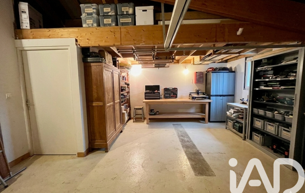 La maison dispose d’un grand garage de 28 m² avec mezzanine, offrant un important espace de stockage. Elle est mitoyenne d’un côté, uniquement par le garage.