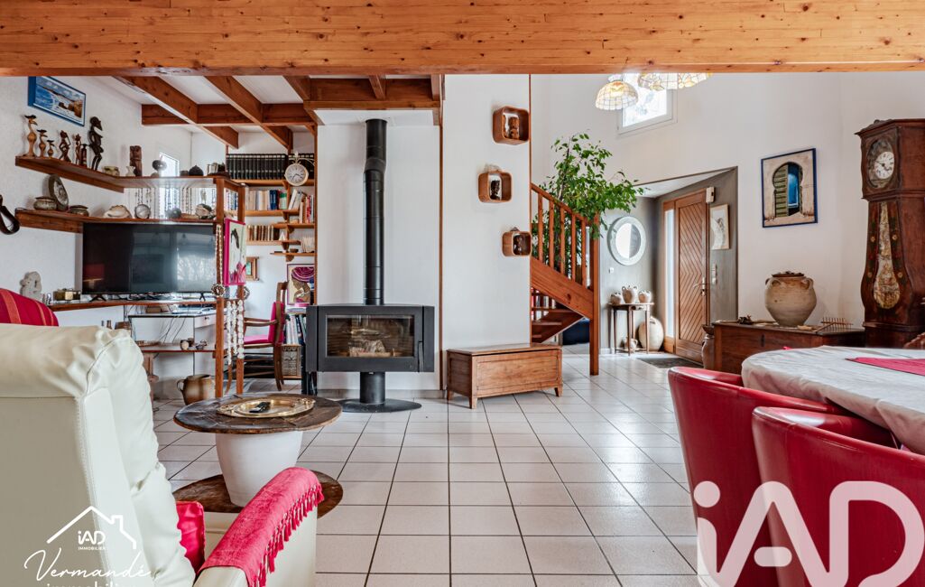 L’entrée s’ouvre sur une superbe hauteur sous plafond menant à une pièce de vie lumineuse d’environ 50 m², agrémentée d’un poêle à bois et largement ouverte sur la terrasse et le jardin grâce à une grande baie vitrée.