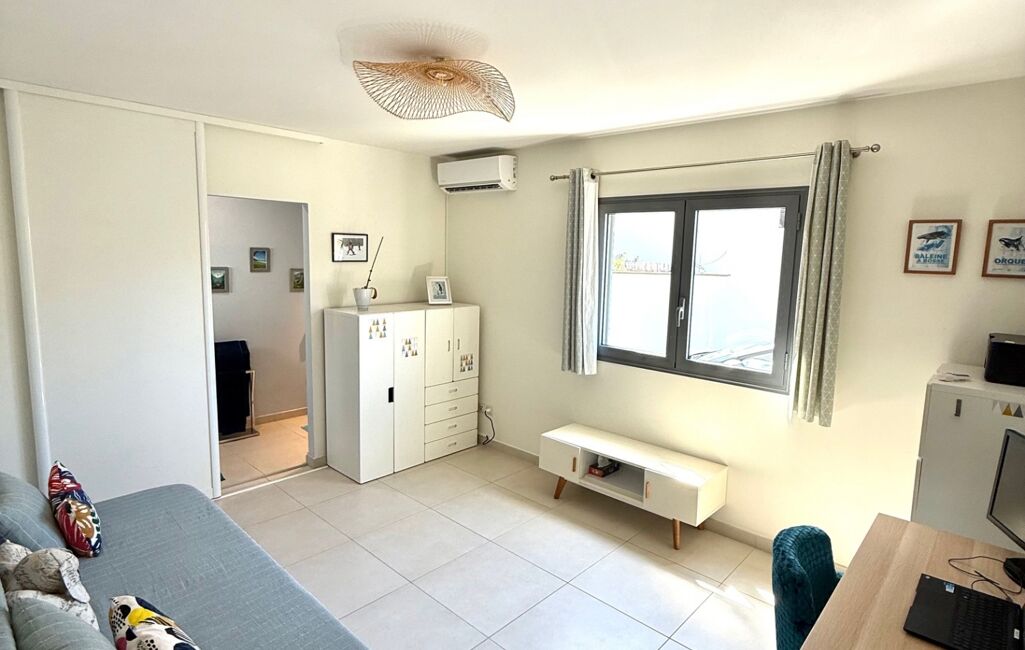 Sur une parcelle de 483 m2, elle se compose d'une entrée avec placards, une salle à manger et un séjour avec vue mer , une cuisine équipée et son cellier, une chambre parentale avec salle de douches et un WC.