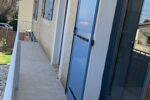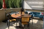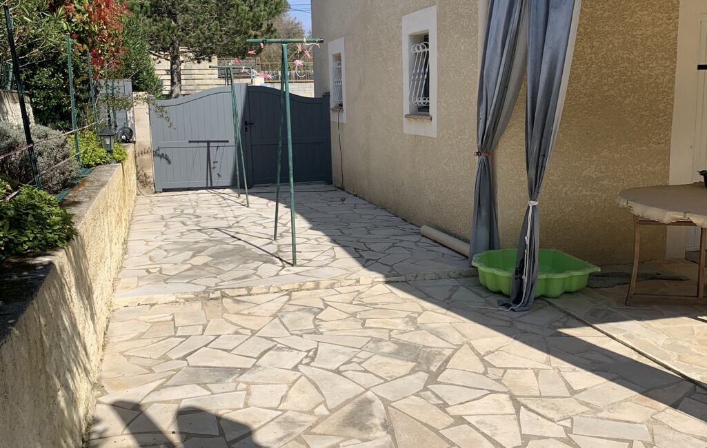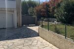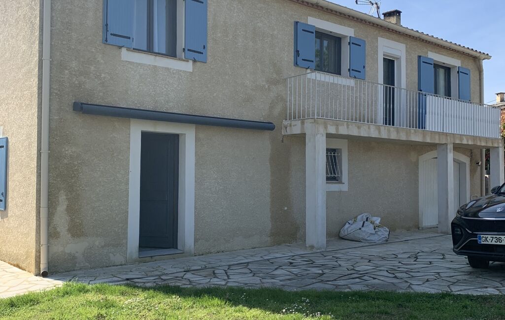 1er : Escalier extérieur, menant à la terrasse équipée d'une pergola bioclimatique, porte fenêtre et porte principale.