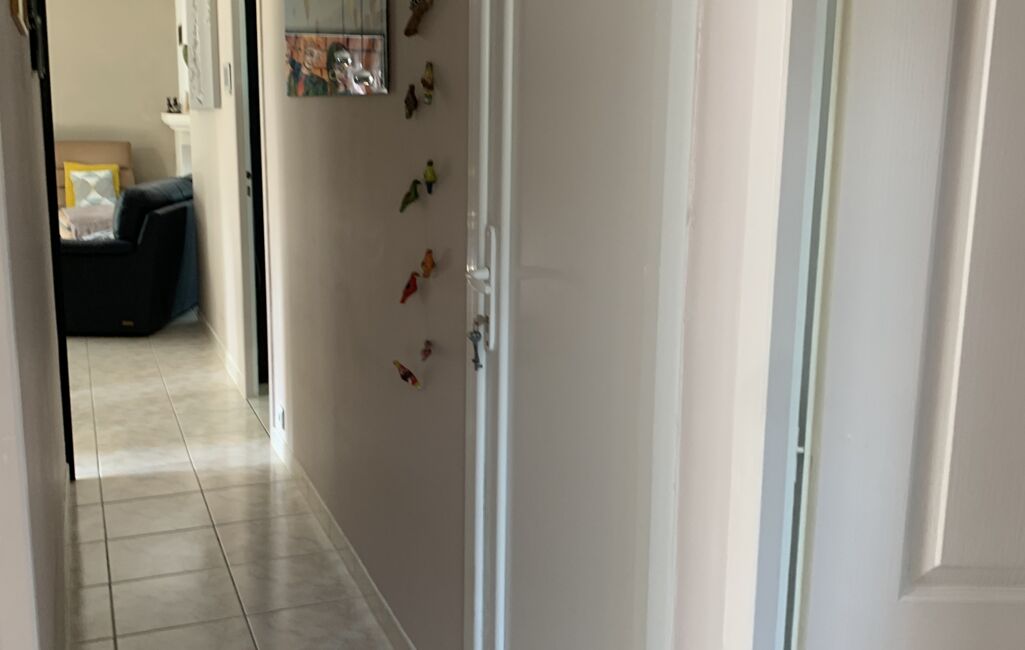 hall d'entrée, wc et vaste pièce à vivre avec cheminée et balcon verrière, la cuisine équipée, couloir donnant accès aux trois chambres, salle d'eau.