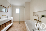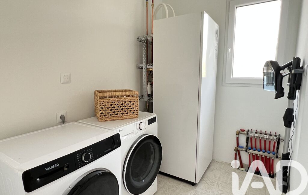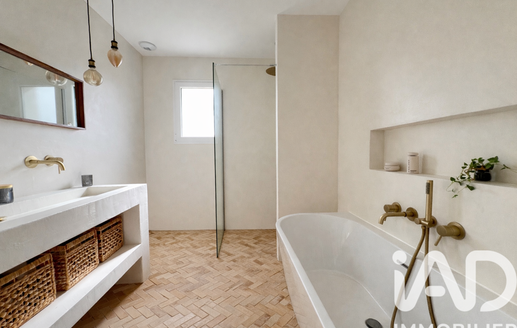 La maison comprend 3 chambres dont une avec un très joli dressing aménagé, une salle de bain moderne disposant d'une douche et d'une baignoire avec un magnifique sol en pierres de Bejmat et des murs en béton ciré réalisés par un professionnel, un WC séparé avec lave-mains, une buanderie et un garage de 18m2 avec porte motorisée.