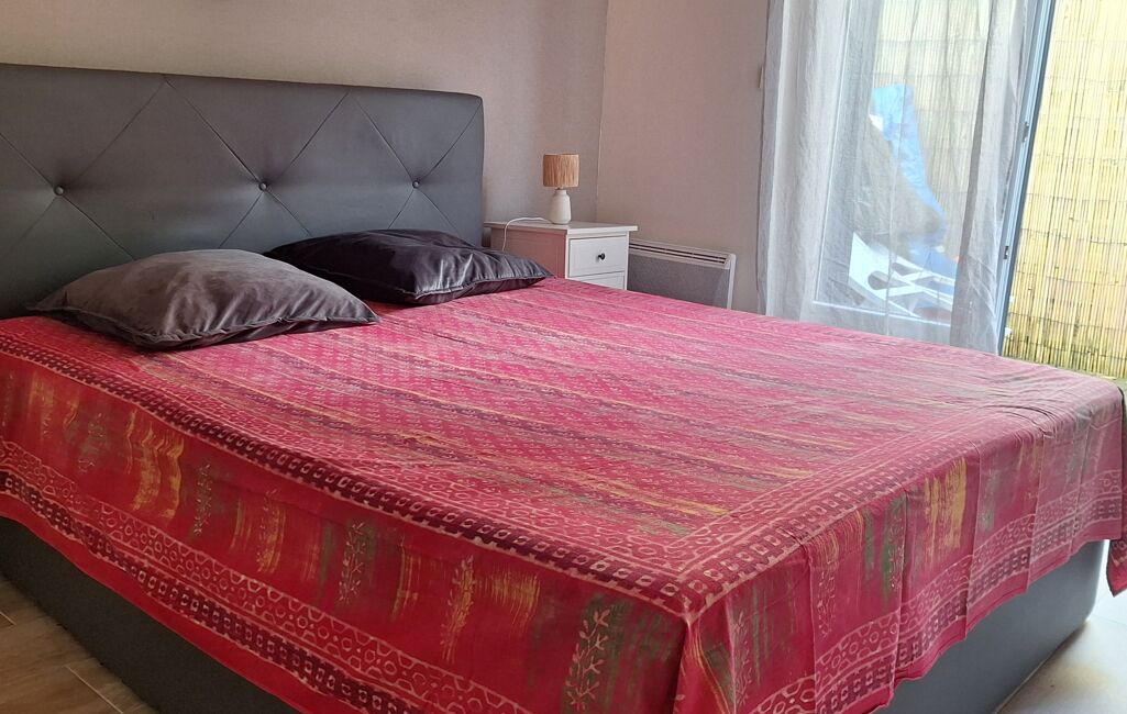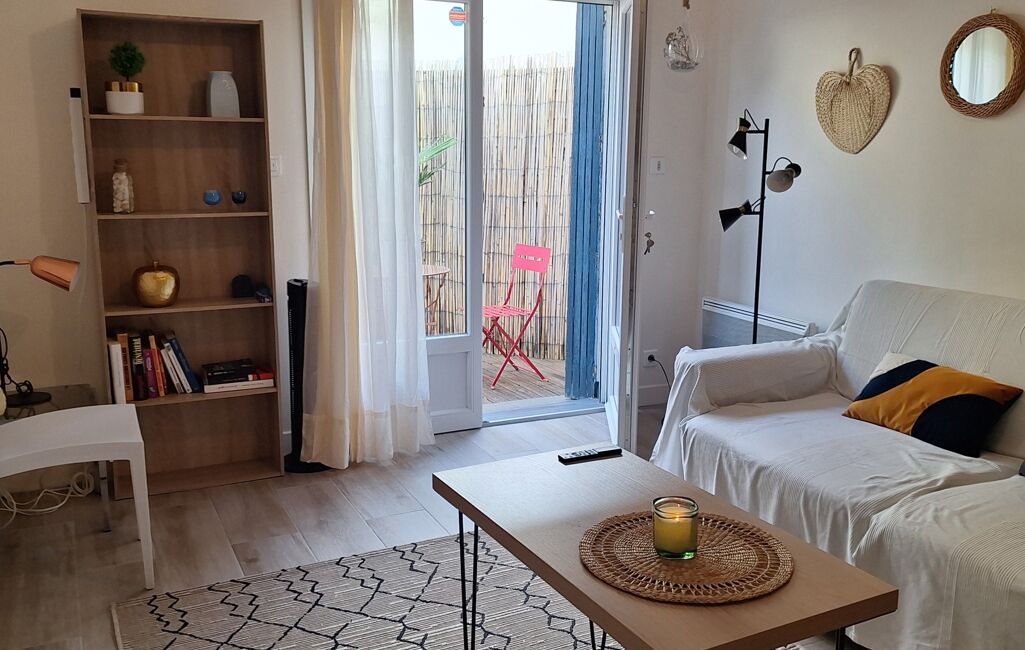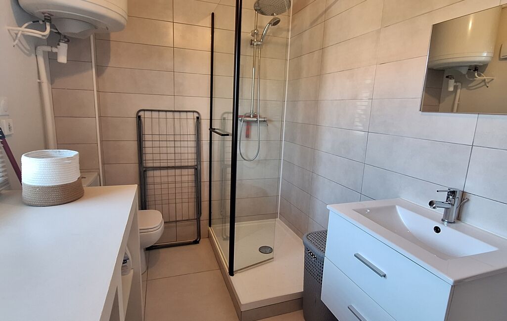 Entrée avec un séjour qui donne sur une belle terrasse de 17 m² , cuisine équipée et aménagée, 1 chambre avec accès terrasse aussi ainsi qu'une salle d'eau avec WC.