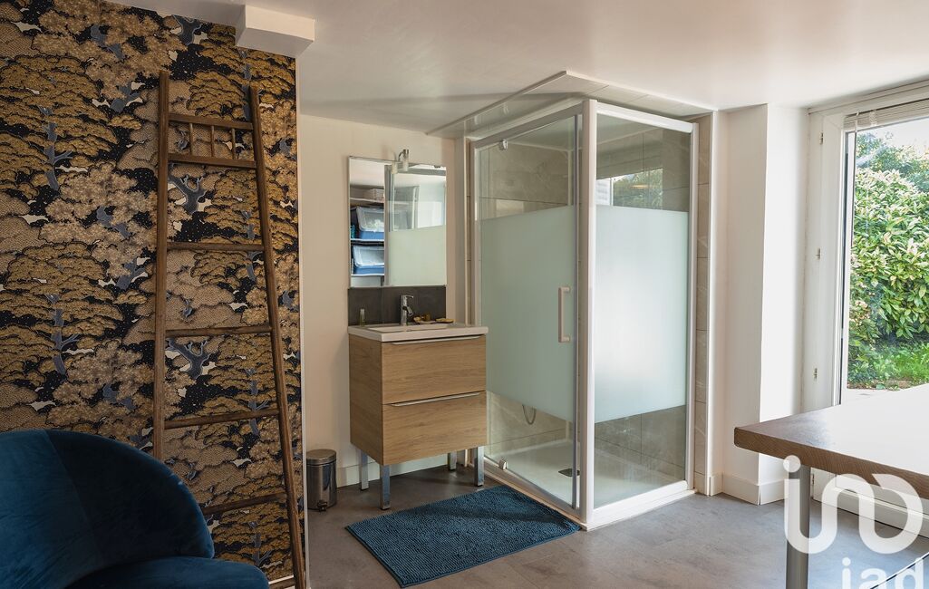 Palier desservant l'accès au jardin, un séjour traversant très cosy baigné de lumière sur parquet, avec cheminée et cuisine verrière aménagée, une chambre avec salle d'eau privative et placards, un WC, un espace modulable (bureau, atelier, coin jeux…).