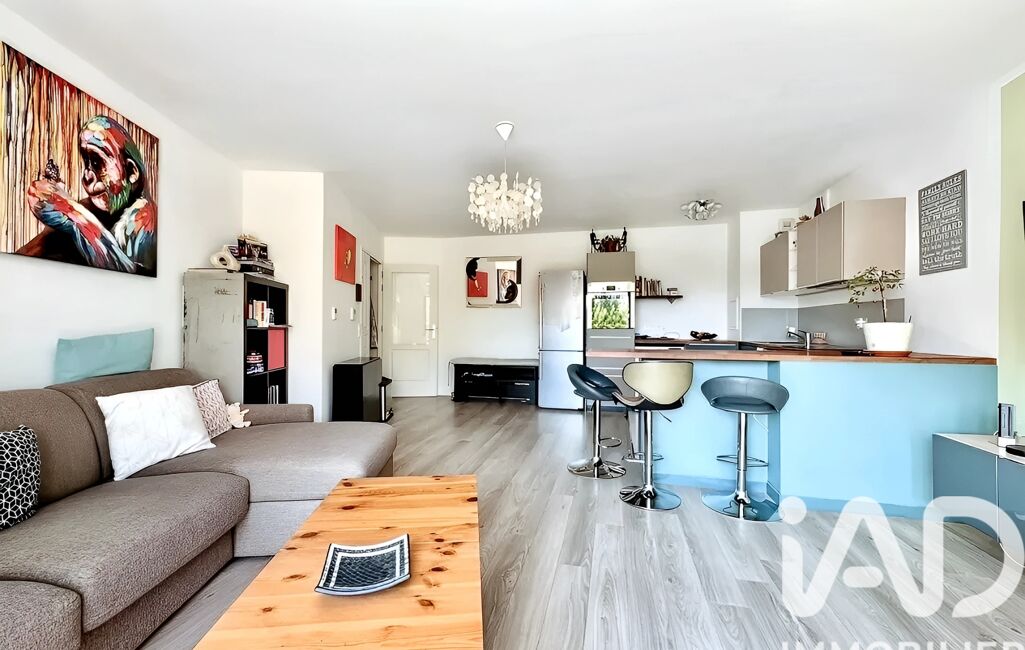Séjour lumineux de 32 m² avec cuisine ouverte aménagée et équipée, donnant sur un balcon exposé plein sud, sans vis-à-vis et vue sur jardin.