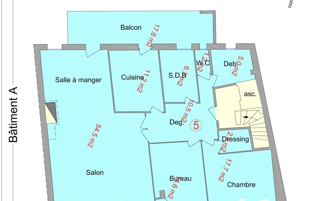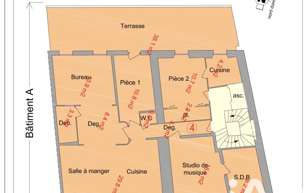 1er étage : T4 de 123 m² avec 3 chambres, terrasse de 40 m²