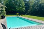 La piscine 12x4 au sel, avec sa plage en bois et son volet motorisé, promet de beaux moments de partage aux beaux jours.