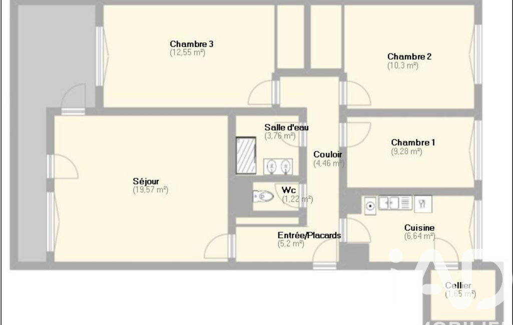L'agencement est optimisé pour séparer clairement les espaces de vie et de repos. La partie jour comprend une entrée, une cuisine indépendante avec cellier et un séjour donnant sur le balcon terrasse. La partie nuit dispose de trois chambres dont 2 avec placards intégrés, d'une salle de douche et de toilettes indépendantes.