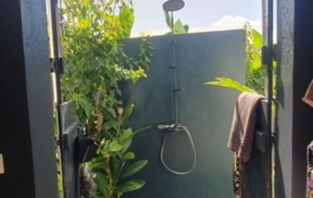 Elle a 2 chambres + une mezzanine, une cuisine moderne + une grande arrière cuisine/buanderie, une salle de douche extérieure et wc indépendant.