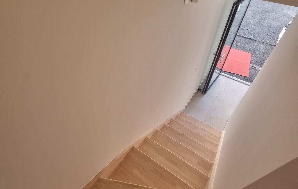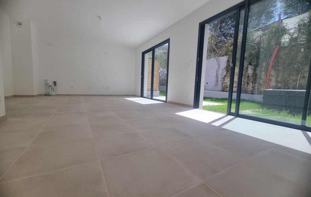 Rez-de-jardin : entrée, séjour lumineux avec cuisine ouverte (28,5 m²), salle d’eau avec WC.