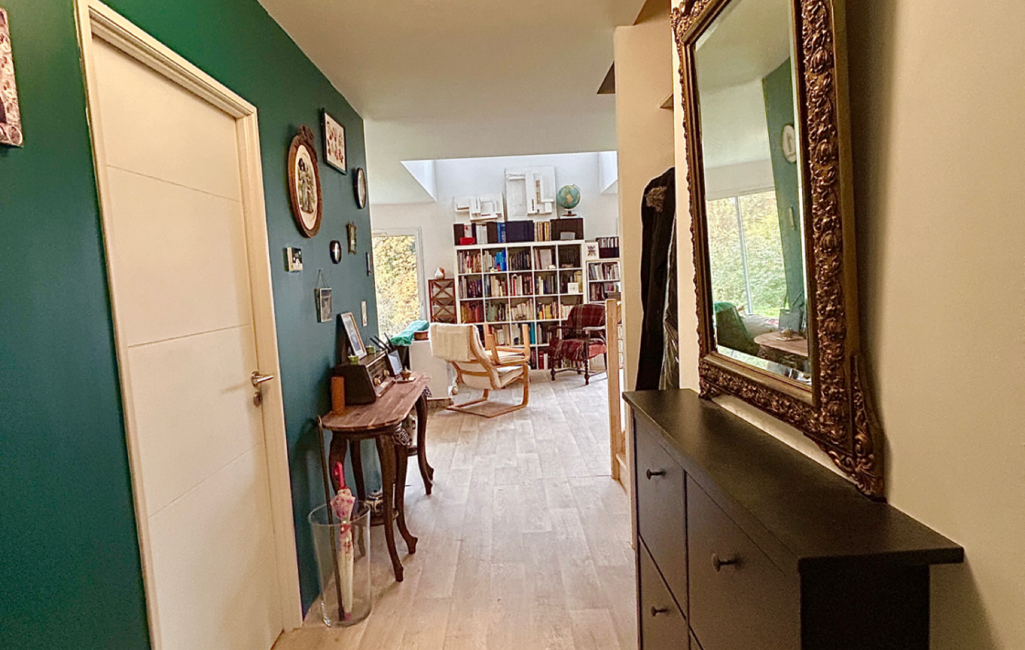 L'étage offre un BEAU palier surplombant le salon desservant TROIS CHAMBRES (16, 14, 16 m2), un cabinet de toilettes séparé et une grande salle de bains moderne.