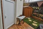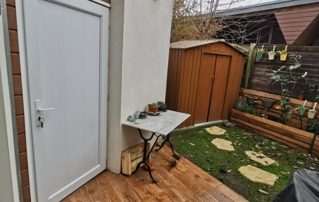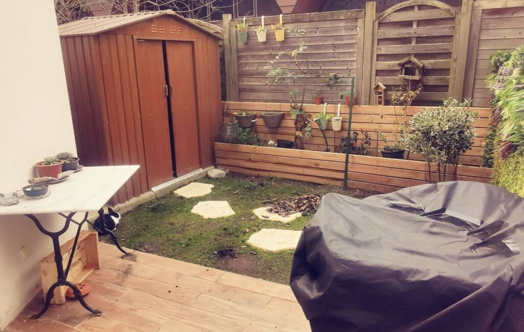 Elle nous offre 3 pièces dont une vaste entrée avec un WC, une belle cuisine équipée, un salon accueillant donnant sur la terrasse et son jardinet avec accès sur une grande pièce extérieure sur deux niveaux servant de rangement.