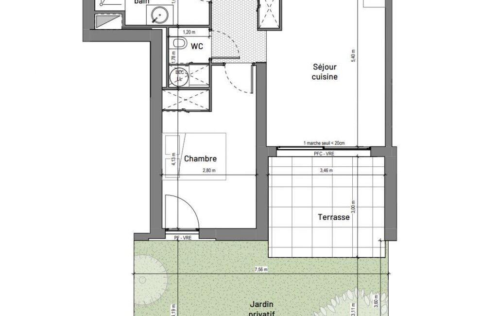 L’appartement se compose d’une pièce de vie avec cuisine ouverte de 22,8 m² environ, lumineuse et fonctionnelle, donnant accès à une terrasse de 10,4 m² environ exposée sud / ouest, prolongée par un jardin privatif de 27,9 m² environ.