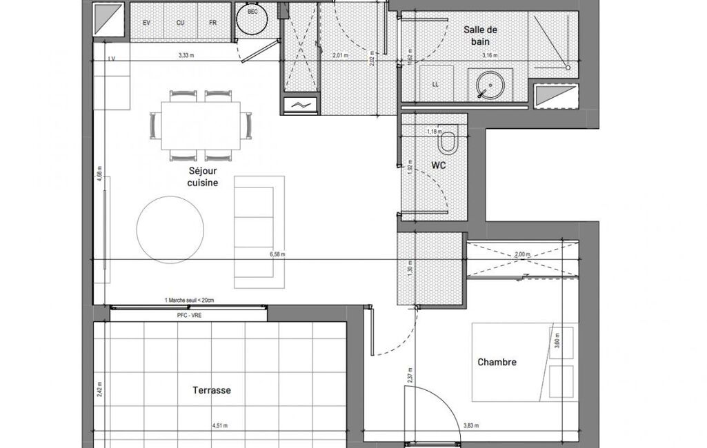 L’appartement se compose d’une pièce de vie avec cuisine ouverte de 29,7 m² environ, donnant accès à une terrasse de 10,8 m² environ, exposée sud/ouest, idéale pour profiter des beaux jours.