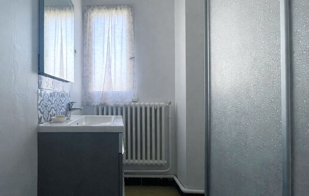 - Le rez-de-chaussée surélevé offre une entrée, un séjour lumineux d’environ 24 m² avec cheminée à insert et accès balcon, une cuisine indépendante, un WC avec lave-mains ainsi qu’une chambre avec salle d’eau communicante. Idéal vie de plain-pied.