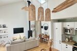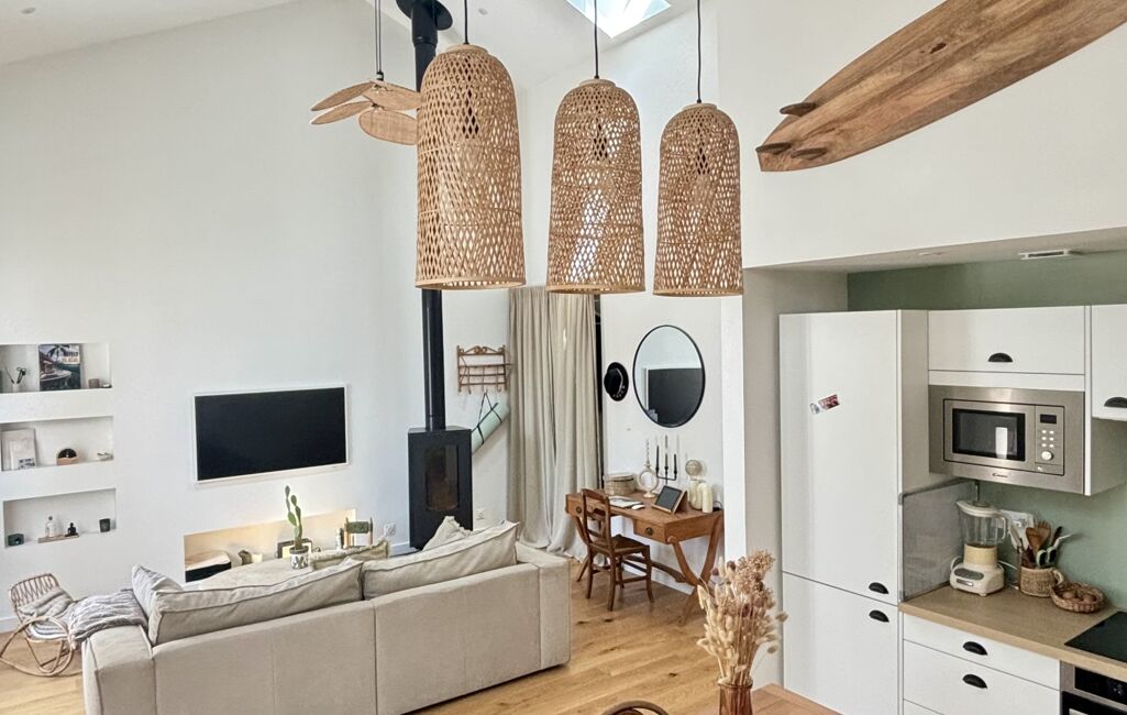 La pièce de vie, lumineuse et spacieuse, bénéficie d’une belle hauteur sous plafond, d’un poêle à bois chaleureux et d’une cuisine ouverte aménagée.