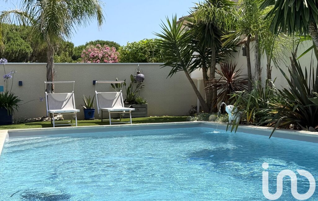 À l’extérieur, le jardin clos révèle un univers végétal intime — palmiers, oliviers, senteurs d’été — une piscine aux reflets minéraux, une pergola maçonnée, promesse de déjeuners d’exception.