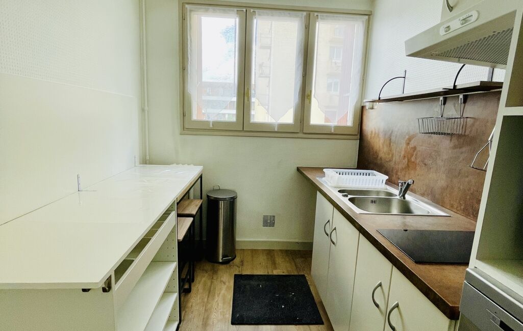 iad France - Yves Zenkovic vous propose: Charmant T3 de 57 m² situé au 1er étage d’une résidence bien entretenue de 1964. Il se compose d’une entrée, d’un séjour lumineux, d’une cuisine séparée, d’un dégagement desservant un cellier, deux chambres, une salle d’eau et un WC. Cave de 7 m² en sous-sol. Parking collectif non numéroté. À proximité immédiate (moins de 600 m) : tram Hôtel de Ville, écoles, pharmacie, médecins…