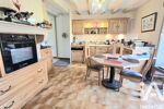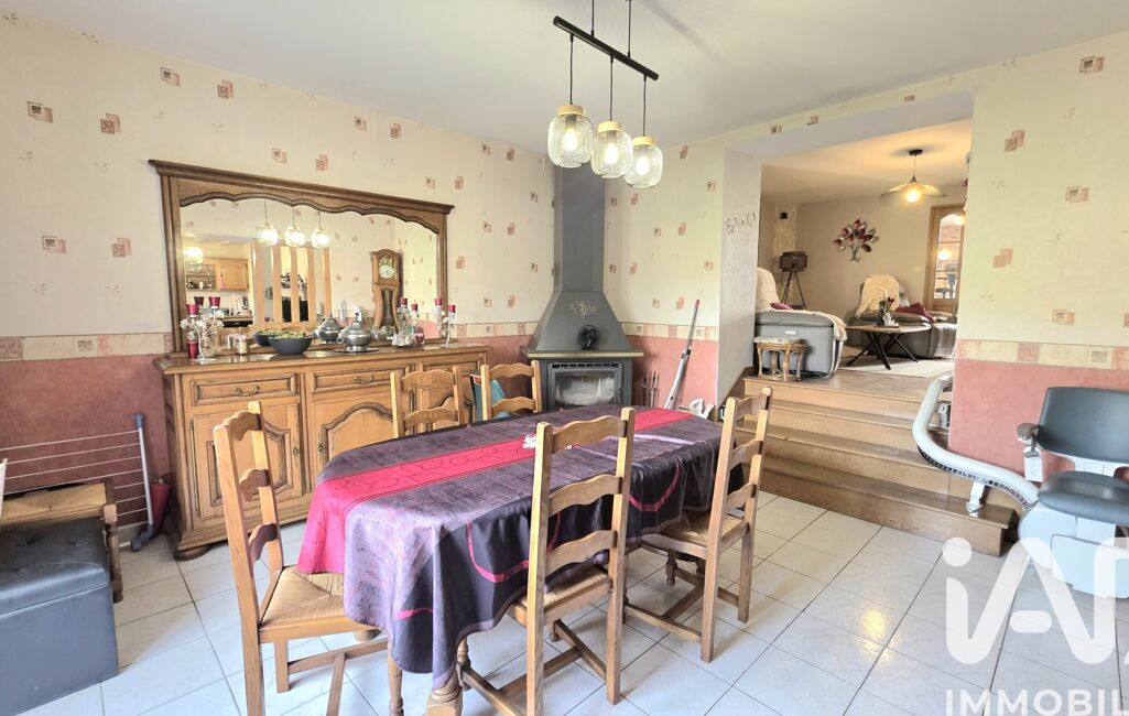 Une salle à manger avec insert à bois, un salon chaleureux et une grande chambre.