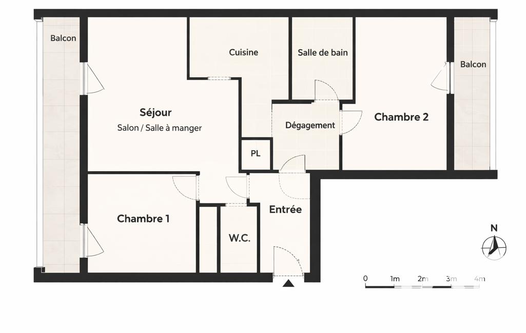 Dès l’entrée, vous découvrez un espace accueillant avec WC séparés, puis un séjour lumineux et convivial accompagné d’une cuisine indépendante entièrement équipée, réalisée sur mesure dans un style moderne et élégant. Le salon s’ouvre sur un balcon filant sans vis-à-vis, particulièrement agréable pour profiter de moments au calme, et accessible également depuis une première chambre de plus de 10 m² avec placard intégré. Un dégagement dessert ensuite une salle de bains ainsi qu’une seconde chambre spacieuse avec accès à un second balcon, apportant encore plus de confort au quotidien.