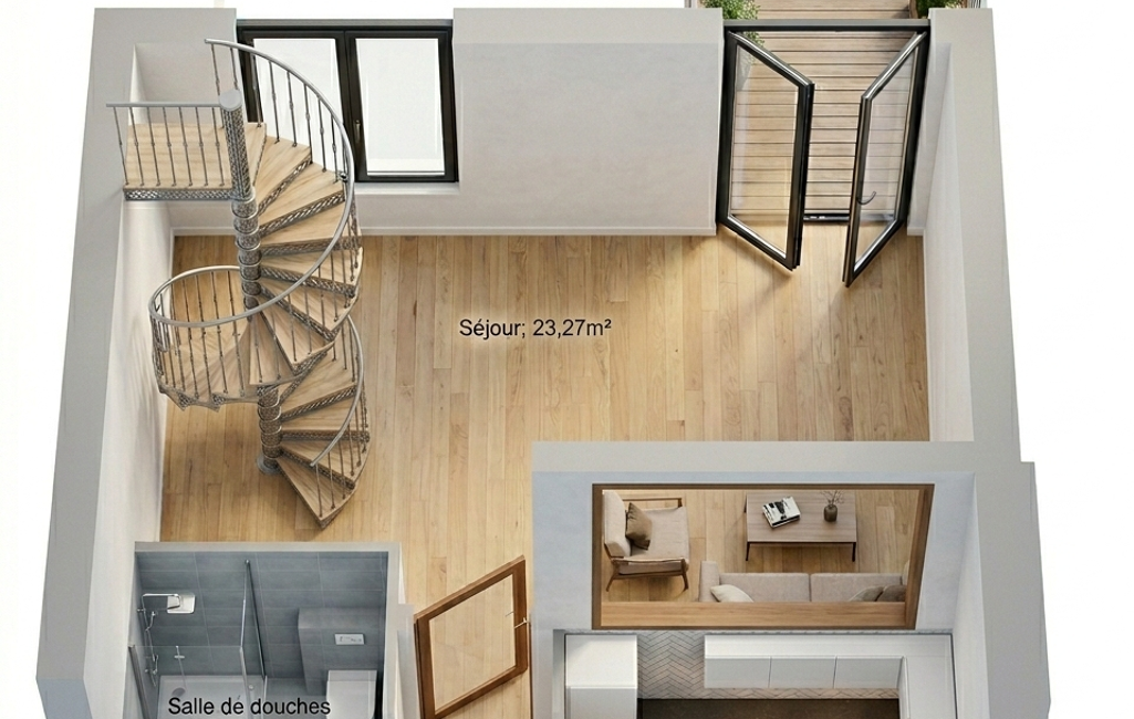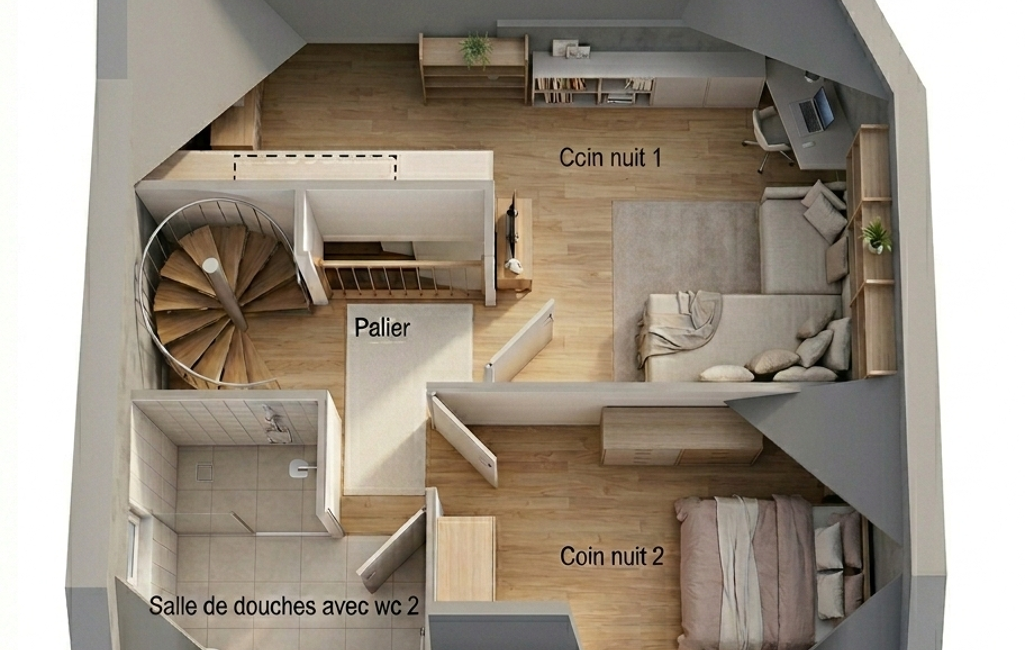 Grand T2 bis en duplex, bien agencé, avec de nombreux rangements et parfaitement optimisé.