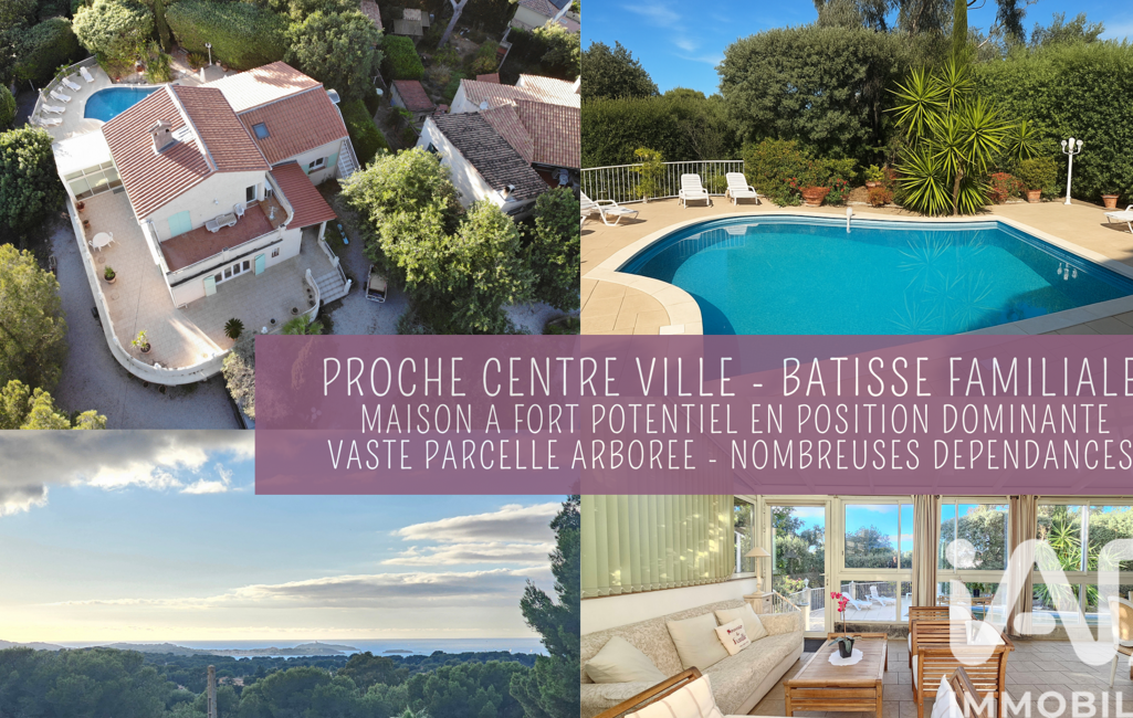 + Situation : Sa situation dominante et son vaste terrain arboré en font un bien rare au calme mais à proximité immédiate du centre-ville de Six-Fours. La vue y est vraiment belle, dégagée et lointaine depuis chacune des expositions.