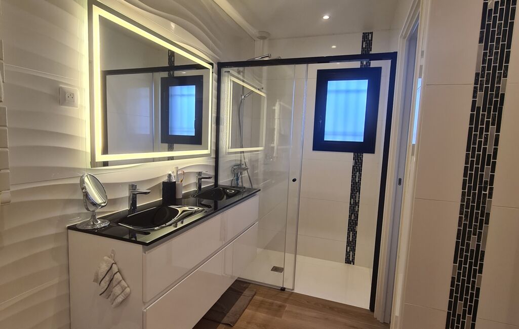 L'espace jour se compose d'une belle entrée avec wc indépendant, un salon chaleureux ouvrant sur la terrasse et sa piscine au sel ainsi que d'une magnifique cuisine moderne et épurée.